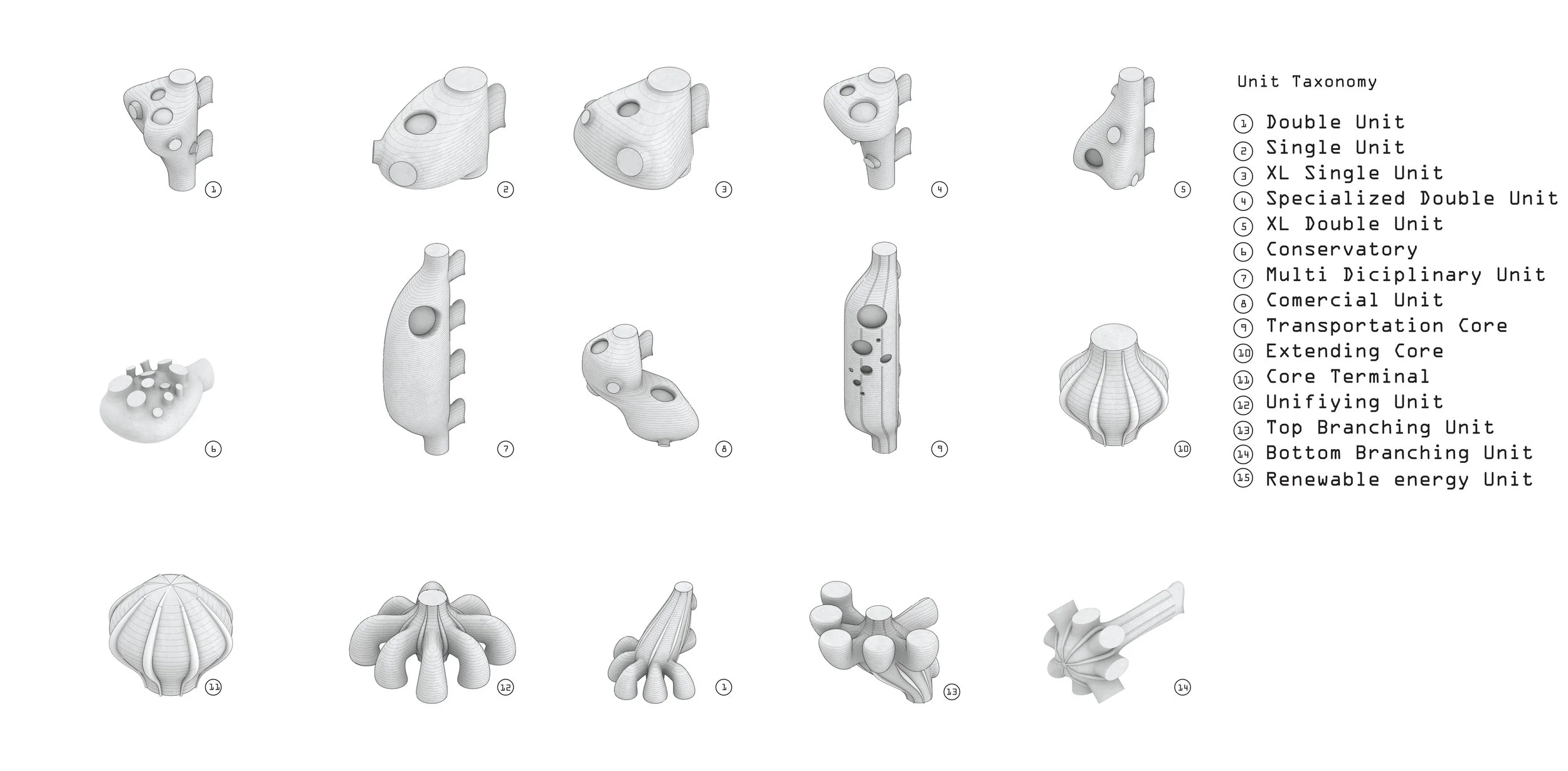 When in favorable environment, succulents can grow stems up to 60 cm long, favoring their survival and ability to thrive in harsh environmental conditions. The Sedum-morganianum is an example, native to Latin America, whose leaves are large fleshy modules connected to their stem, intertwined closely together to increase the number of leaves and save energy. The tower then is designed as a refugee center in the shore of Barcelona. The overall structure is composed of single units and others that can perform multiple multidisciplinary programs. The tower however can only grow under a rigid set of rules from which the unpredictable influx of immigrants will dictate its growth. Rules are inspired on Fibonacci sequence, where units are labeled numerically from one to four and placed on a asymmetrical nine square grid sequentially. As the units stack and coincide vertically, they are able to be interchanged for larger and more complex modules. The system is capable of growing vertically and at moments of high immigrant stress, diagonally. The main core is allowed to grow every 4 floors, and create a “neighborhood” of single home pods. Among them, few individual pods can link together or transform into new programmatic implications within those detached neighborhoods.